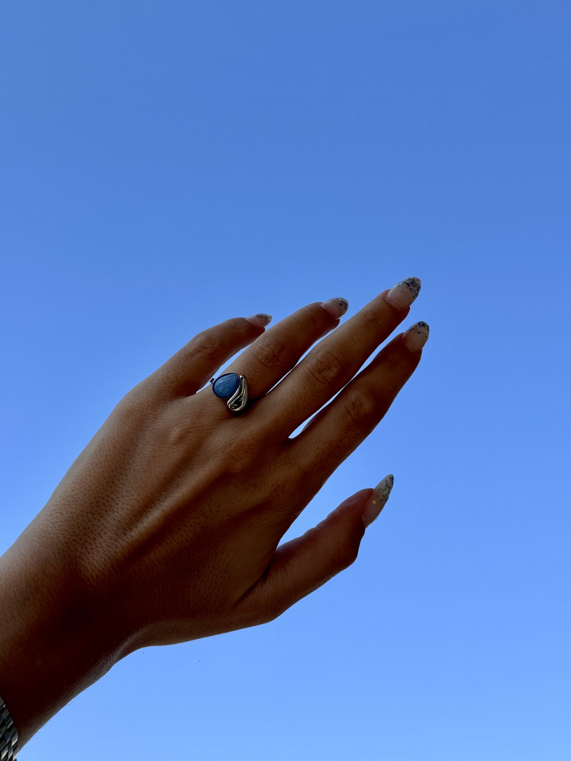 ΑΤΣΑΛΙΝΟ ΔΑΧΤΥΛΙΔΙ ΣΕ ΑΣΗΜΙ ΧΡΩΜΑ ΜΕ ΜΠΛΕ ΛΕΠΤΟΜΕΡΕΙΕΣ, ΔΙΑΘΕΤΕΙ ΑΥΞΟΜΕΙΩΣΗ ΩΣΤΕ ΝΑ ΕΦΑΡΜΟΖΕΙ ΤΕΛΕΙΑ ΣΕ ΚΑΘΕ ΜΕΓΕΘΟΣ ΔΑΧΤΥΛΟΥ. ΕΙΝΑΙ ΥΠΟΑΛΛΕΡΓΙΚΟ ΚΑΙ ΑΝΘΕΚΤΙΚΟ ΤΟΣΟ ΣΤΟ ΝΕΡΟ ΟΣΟ ΚΑΙ ΣΤΟ ΑΡΩΜΑ.